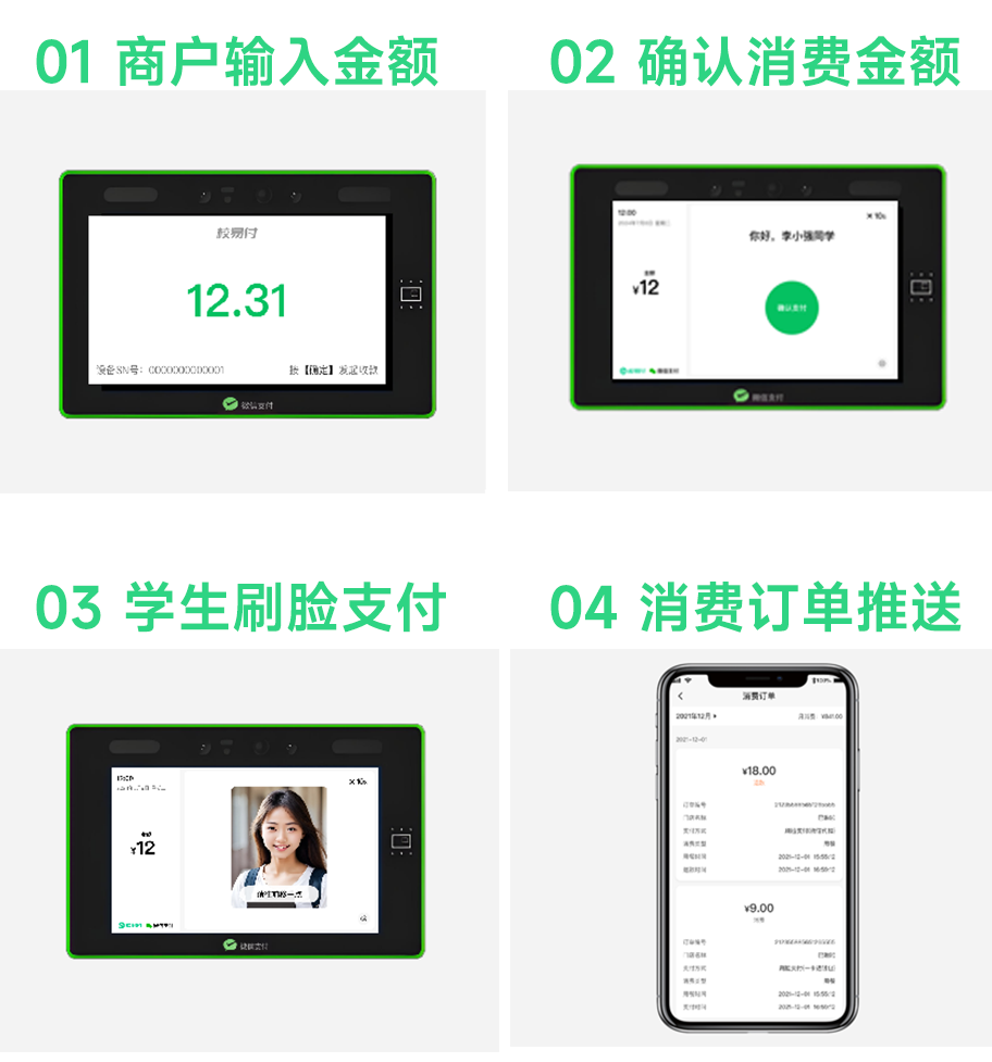 商户在设备上输入消费金额,学生面对摄像头刷脸,设备快速识别身份,无论是食堂档口、校园超市还是小卖部,都能实现“刷脸即付”,彻底解决“忘卡、丢卡、余额不足”的尴尬。同时,家长还能通过小程序实时收到消费提醒,清楚知道孩子“什么时候买了什么”。