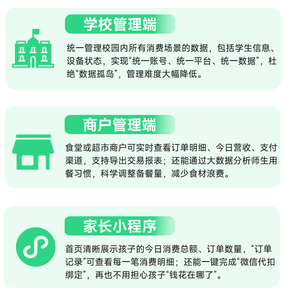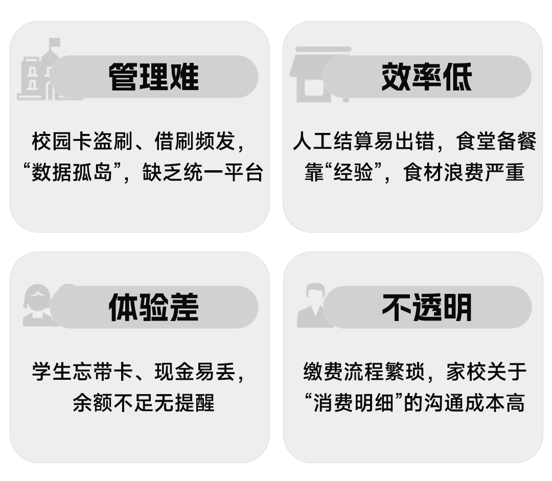 政策导向下,传统校园消费模式的短板愈发凸显,成为行业共性难题。如管理端存在校园卡盗刷、借刷频发,消费数据分散形成“数据孤岛”;效率端依赖人工结算易出错,食堂备餐凭“经验”导致供需失衡、食材浪费严重;体验端学生忘带卡、现金丢失问题突出,家长难以追溯消费记录、担忧营养摄入;透明化层面则面临缴费流程繁琐、家校关于消费明细的沟通成本高等问题。在此背景下,“科技赋能校园消费”成为行业破局的核心方向。
