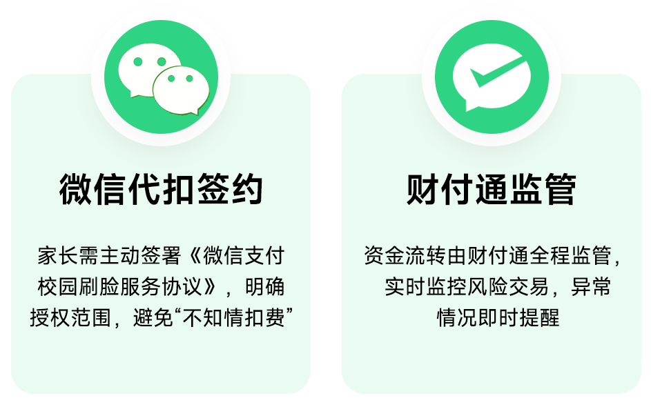针对行业关注的资金安全问题,方案建立“学校-商户-家长”三方共管机制。家长需主动签署《微信支付校园刷脸服务协议》明确授权范围,避免“不知情扣费”;资金流转全程由财付通监管,实时监控风险交易并对异常情况即时预警;每一笔交易明细均可被三方查看,确保资金去向“有迹可循”,化解校园消费领域的安全信任难题。